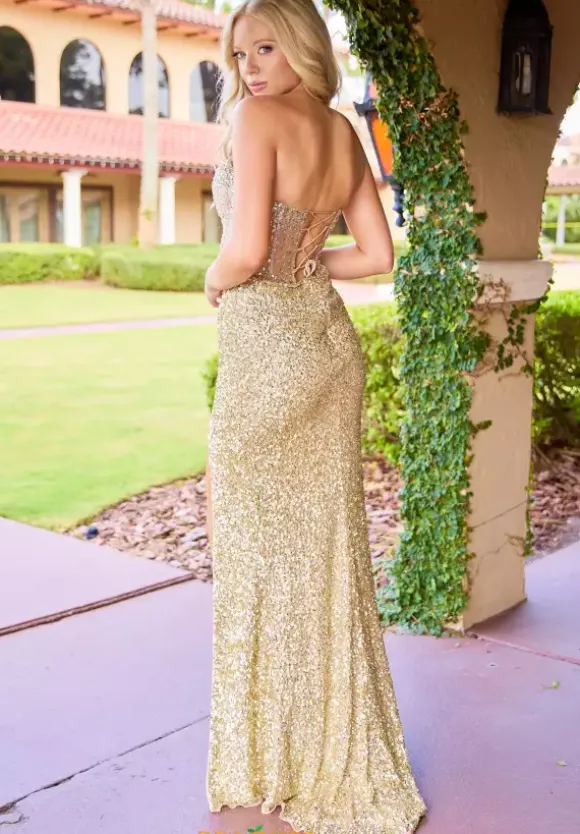 Feel like your dripping in sparkle when you show up in this Primavera all over beaded long fitted dress style 4544. This strapless v neckline dress a sheer illusion waisted bodice embellished with large beading. The fitted skirt is fully beaded with sequins that make it extra glistening from all angles.