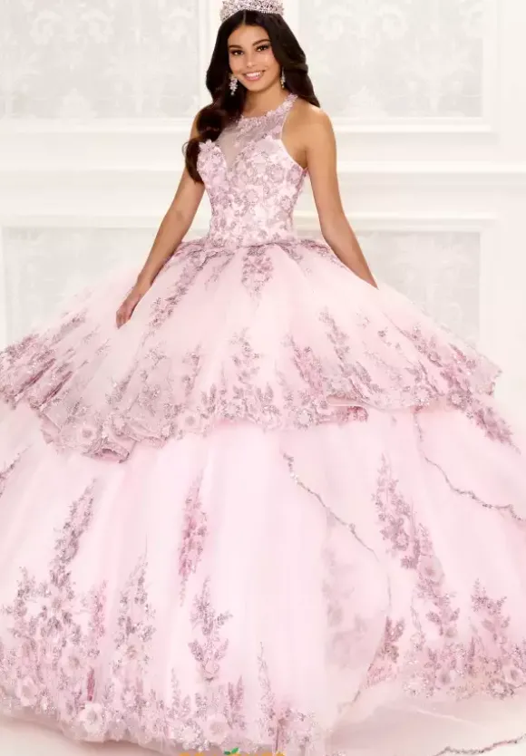 Get ready to be the center of attention with this stunning dress made by Princesa, style PR30082. Featuring a high halter neckline and an open lace up back, this dress is truly breathtaking. The detachable halter piece allows you to switch up your style. Made with beautiful embroidery and gorgeous over layers, this ball gown dress will catch everyone’s attention.