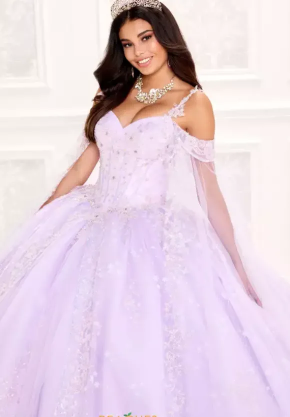 Unforgettable dress starts with this unforgettable Princesa Quinceañera dress, style PR30087. The elegant V neckline of this dress is beautifully complemented by delicate embroidery straps. This stunning dress is adorned with intricate embroidery and sparkling glitter tulle, making you truly stand out. With the detachable off the shoulder long cape, you have the freedom to switch up your looks all night long. The unexpected ruffles on the back adds a fun twist.