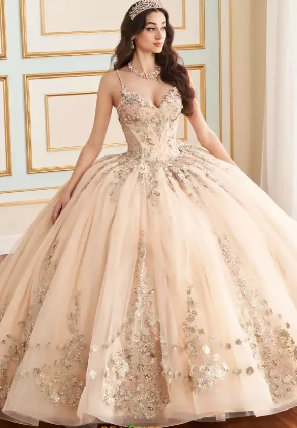 Create wonderful memories with this lovely Princesa dress, style PR30182. This ball gown dress features a graceful V neckline that is adorn in delicate beaded straps. This Princesa dress features a detachable bow and comes with a cape, allowing you to style the dress in various ways. The shimmering sequins on the dress will catch catch everyone’s eye in every picture taken.