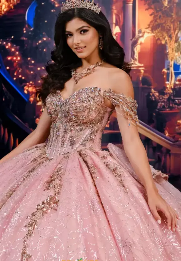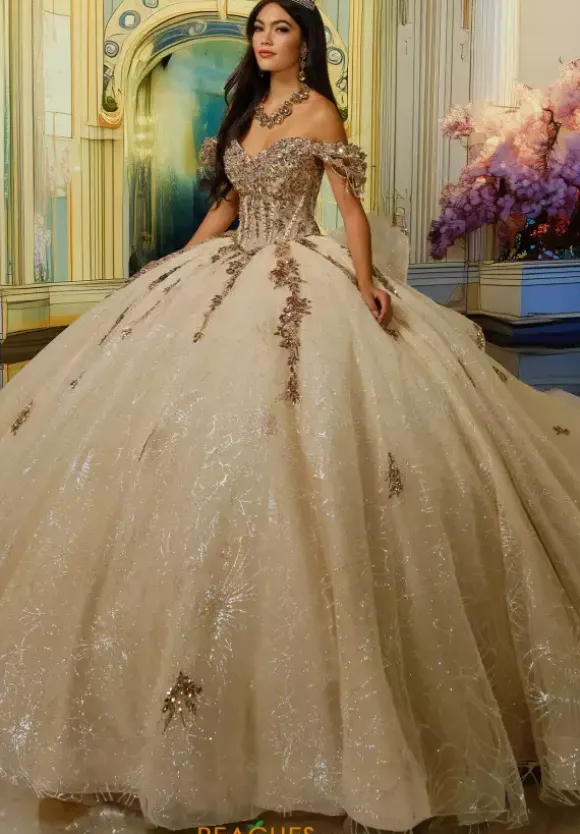 Feel like a modern day princess in this Princesa Quinceanera ball gown PR30191. This ball gown showcases detachable off-the-shoulder straps and separate shoulder straps. The bodice is bedazzles with gold beading and sequins. The full ball gown skirt has pockets with cracked ice glitter material a long with a detachable train and detachable bow in the back. A caplet is included.