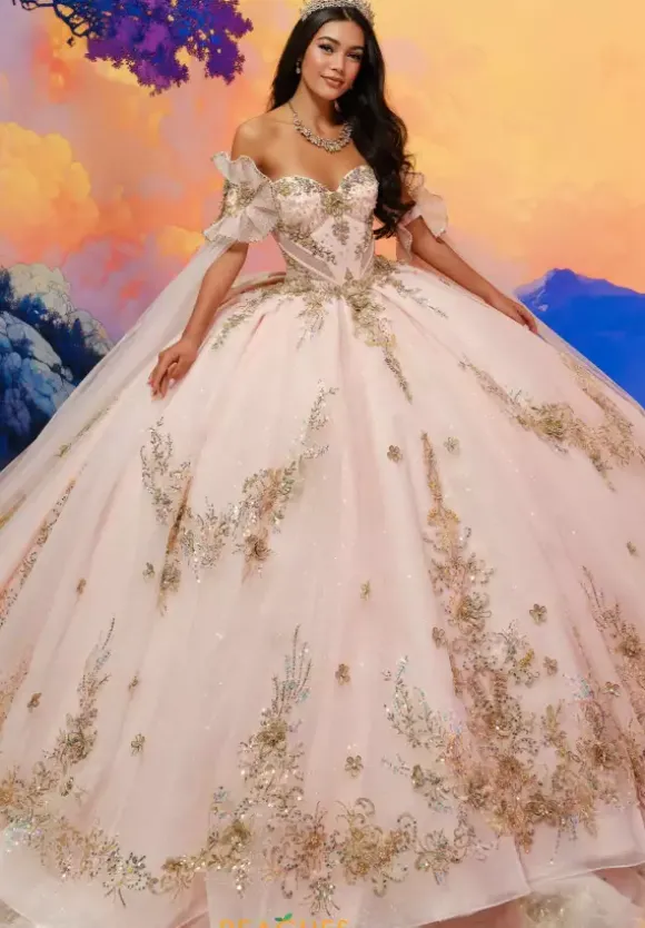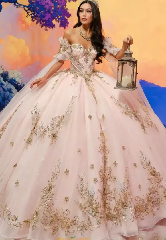 Exude timeless elegance in this breathtaking quinceanera gown by Princesa Quinceanera, style PR30208. Featuring a dazzling sweetheart neckline with off the shoulder and separate long cape sleeves. This stunning bodice has a corset with a back modesty panel and capelet thats included. The glitter tulle skirt has a perfect detachable bow and train for added drama. Adorned with applique, beadwork, and lace, this gown guarantees you’ll stand out from the crowd on your special day.