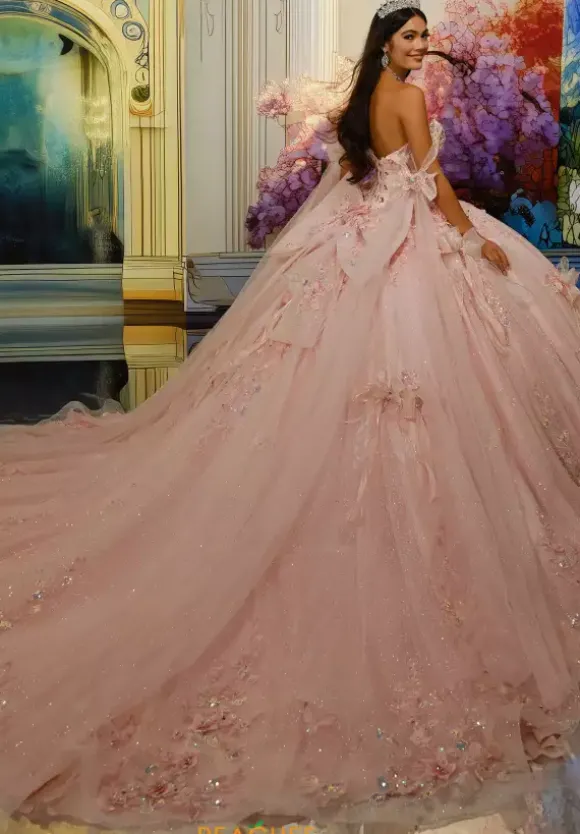 All eyes will be on you when you wear this Princesa Quinceanera ball gown style PR30225. This dress has a gorgeous v neckline bodice with long off the shoulder draping straps. The dress showcases these lovely bows with three dimensional flowers and the back bow is detachable. Capelet included.