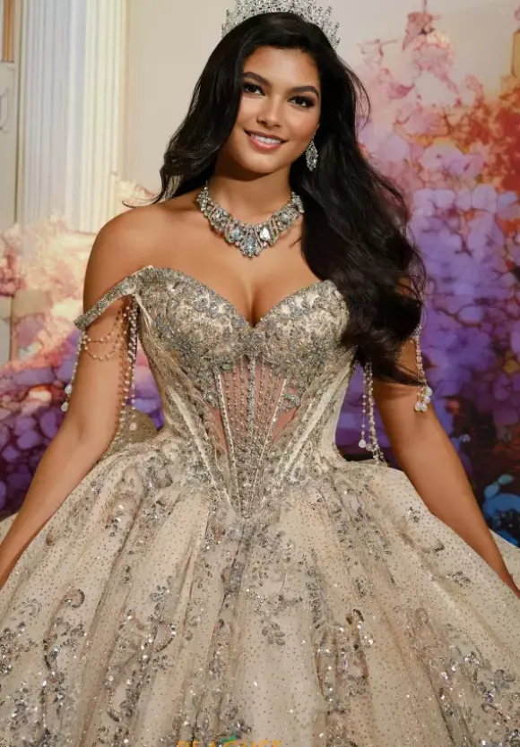 Walk into your party wearing this stunning Princesa Quinceanera ball gown style PR30231. The bedazzled rhinestone encrusted drop waisted bodice has detachable off the shoulder cap sleeves with hanging rhinestone fringe. The glitter sparkling tulle skirt has sparkling appliques with a detachable back bow. A capelet is included.