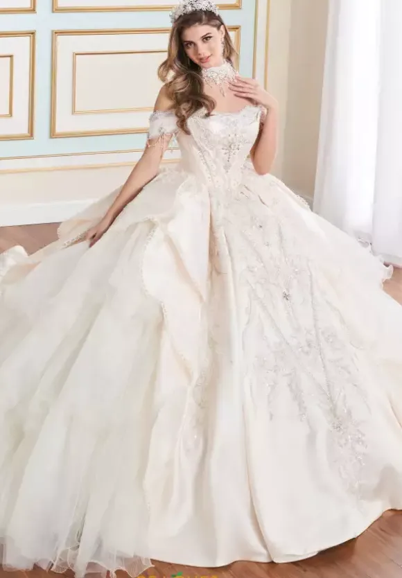 Make memories that last a lifetime with this graceful Princesa dress, style PR70102. The necklace of this dress compliments the off the shoulder scoop neckline. This ball gown dress comes with removable off the shoulder straps, allowing you to wear it in two different styles. The beautiful beadwork on this satin dress will be a focal point in all your photos. The skirt hoop is included to give the gown a full look.