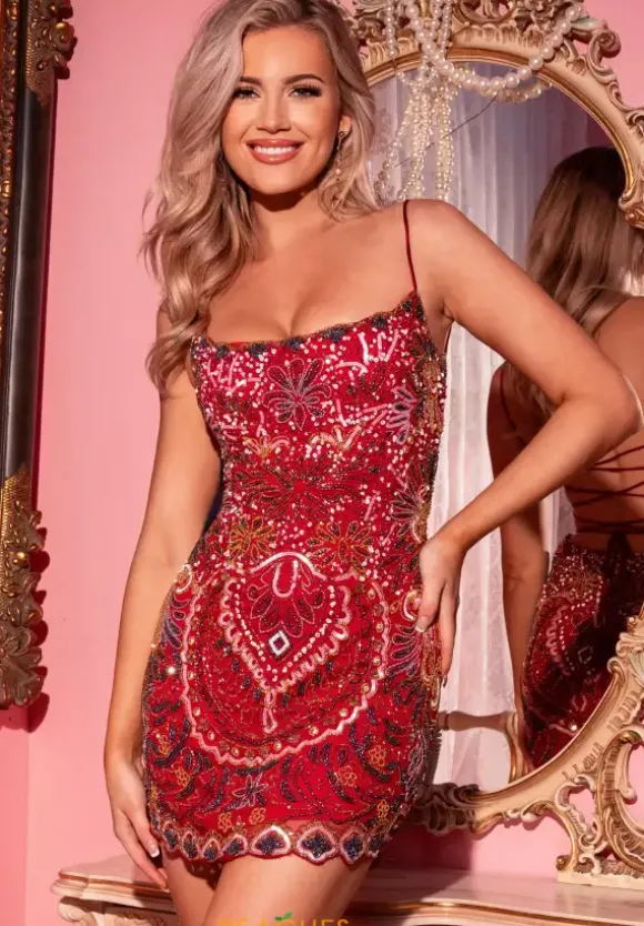 We are loving this one of a kind look 40080 by Rachel Allan. This beautiful boho chic style showcases spaghetti straps and a scalloped scoop neckline. The fitted sheath silhouette will hug your figure nicely and is embellished with an intricate bead pattern. Short skirt falls about mid thigh in length and is finished with a unique scalloped hemline. Flirty open back is supported by an adjustable lace up strap.