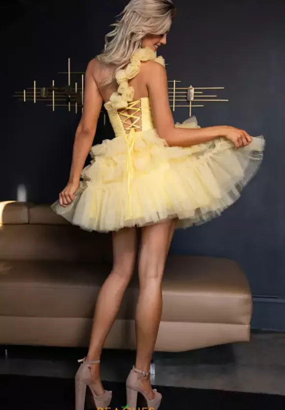 Feel like a modern day princess in this enchanting short dress by Rachel Allan, style 40458. Showcasing an A-line silhouette with a asymmetrical single shoulder strap that lead to a corset lace up back. The bodice has a sweetheart neckline with a key hole opening. This number is fully made out of tulle material. The ruffled layered skirt is the perfect final touch.