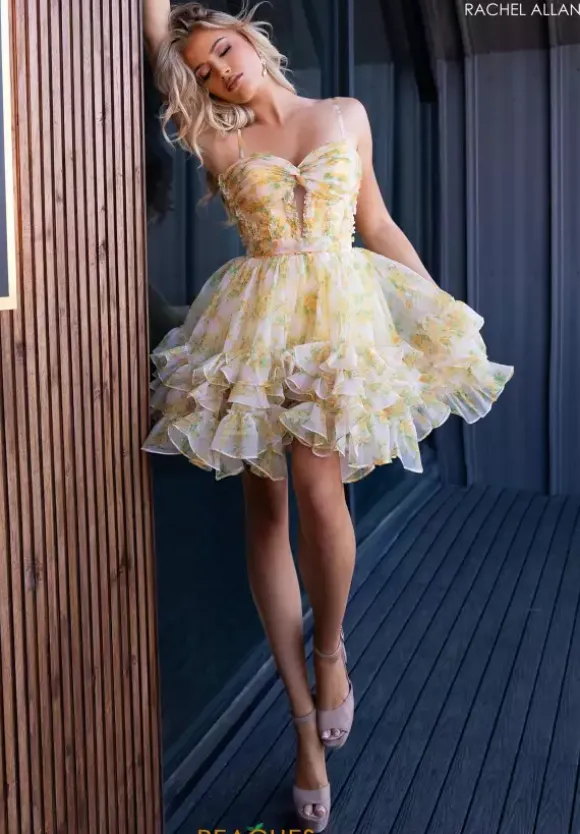 Feel like a princess in this enchanting short dress by Rachel Allan, 40490. Made of lightweight organza fabric with floral print, this dress is featuring a sweetheart neckline and thin dainty straps that give a classy and sophisticated look. The bodice of this dress has a mesh cut out in the center that adds a fun touch to the ensemble. The skirt has beautiful ruffles at the end that give it an airy and delicate look while also giving the dress an exquisite a-line silhouette. This dress is sure to have you feeling like beautiful all night long.
