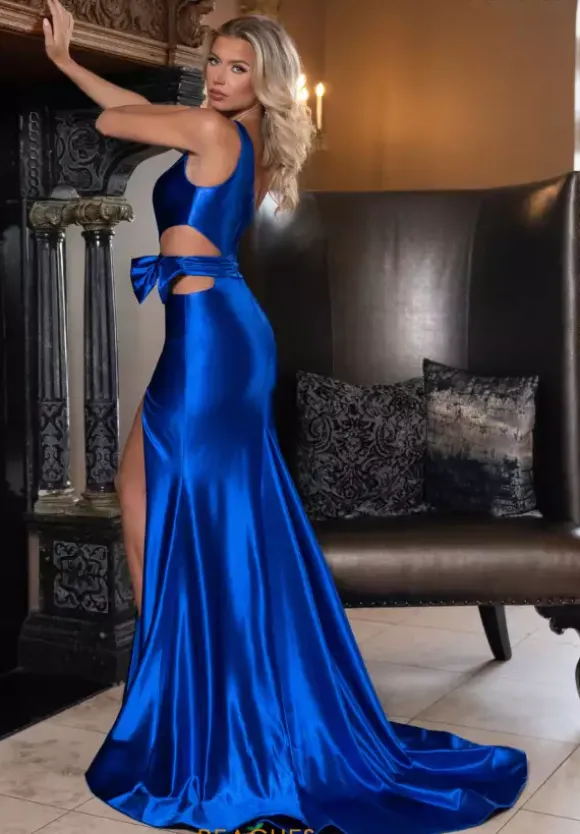 Feel chic in this all over stretch satin fitted dress from Rachel Allan style 70736. The single shoulder asymmetric neckline bodice has a key hole opening on the side with a wrapped ruched waist band with bow detail. The fitted material hugs your figure with a thigh high front side slit and long fabulous train.