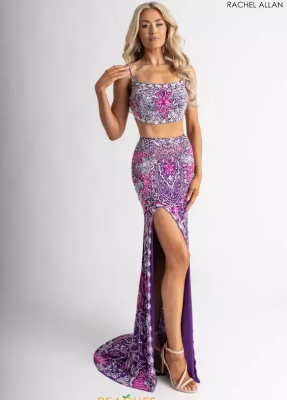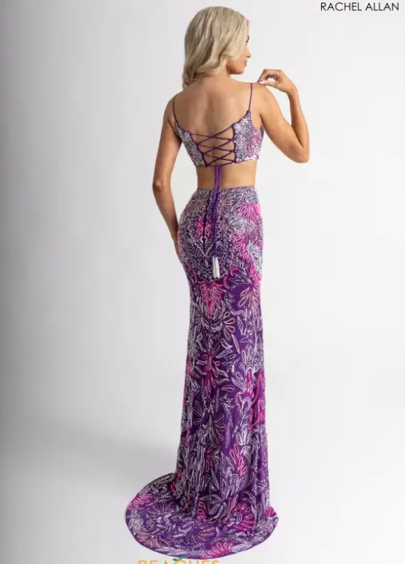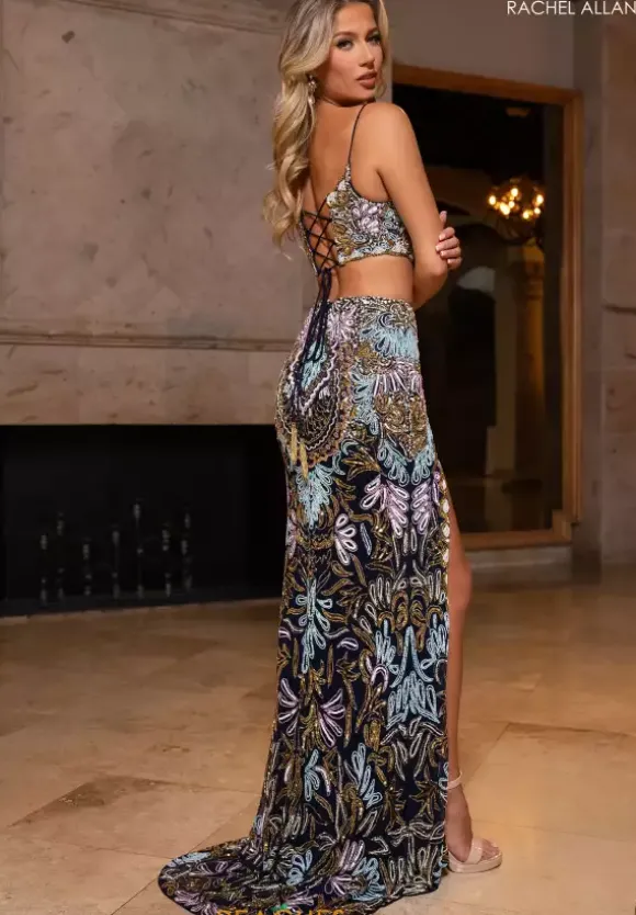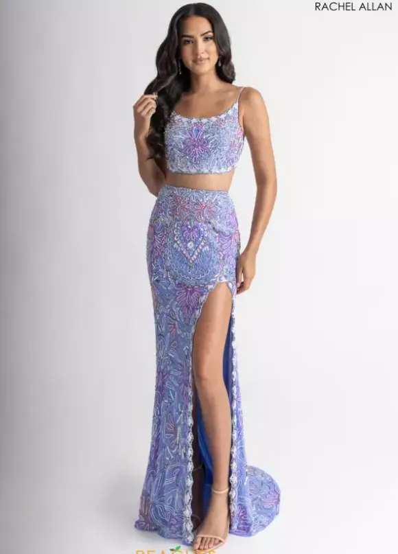Make them stop and stare when wearing this long fitted two- piece dress by Rachel Allan, style 70794. Showcasing a scoop neckline with delicate straps leading to a open corset lace up back. Featuring a fitted skirt that’s made out of stretchy lining material. Fully embellished with unique dazzling beadwork patterns and designs throughout the ensemble. For the perfect final touch it has an outstanding slit and a marvelous train.
