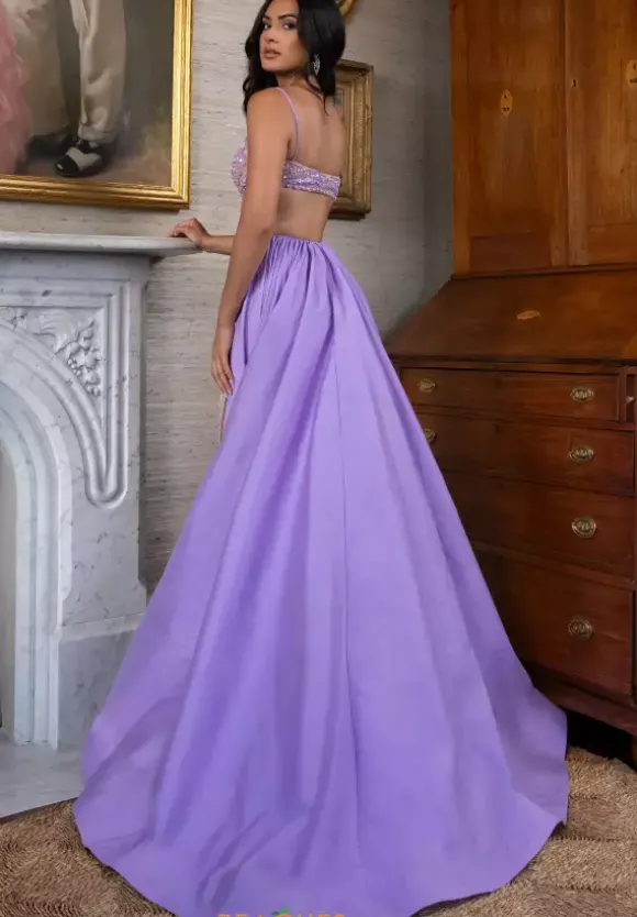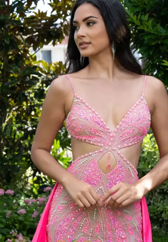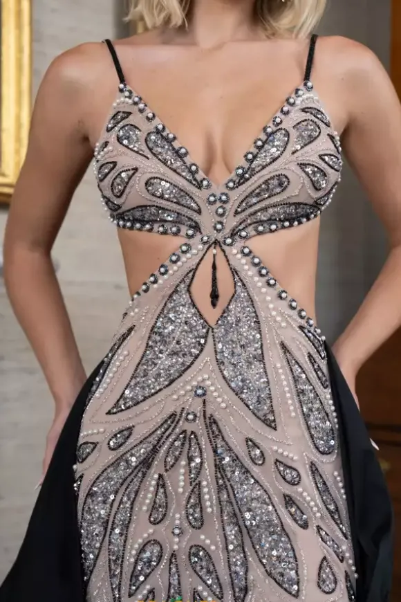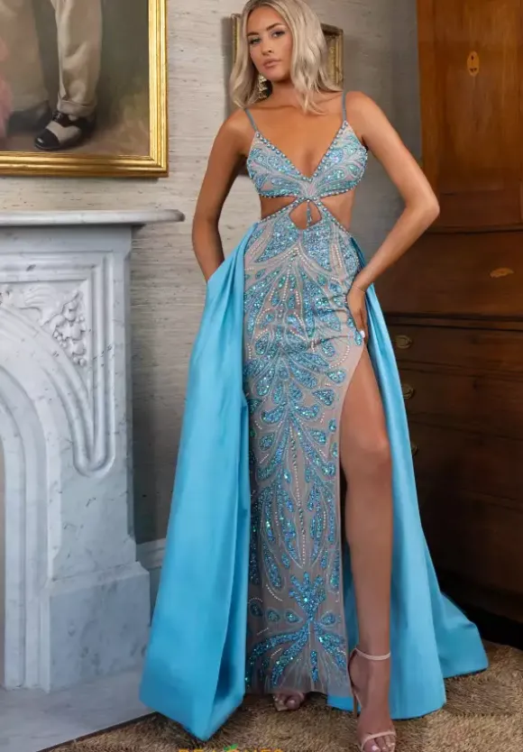Turn heads when you walk in the room wearing this sensational Rachel Allan long dress style 70929 made it stretch nude tulle embellished with sequins and beads. This impeccable gown showcases a fitted bodice with side cut outs, spaghetti straps and open back. The long straight skirt has a high, side slit and a removable taffeta a line long overskirt that sweeps the floor.