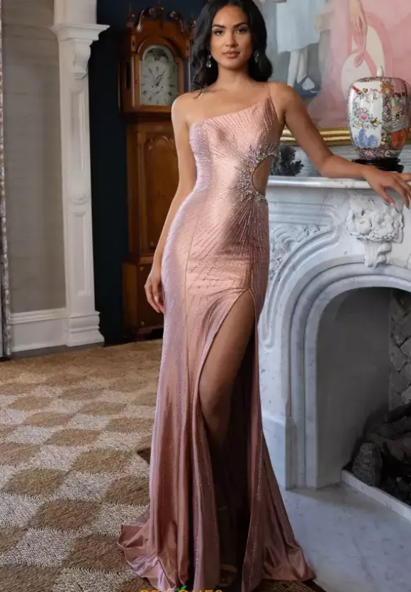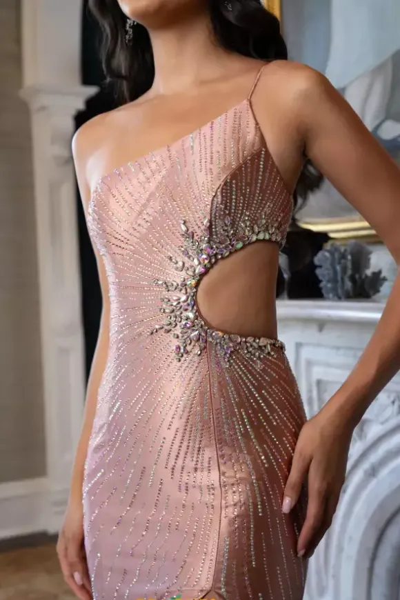 Be the most fascinating in this bright and flattering Rachel Allan prom dress style 70965. This sexy fitted style displays an asymmetrical single shoulder neckline along with a dramatic midriff cutout that accentuates a single side of your waist for a flattering effect. Glimmering beads trace the outline of the cutout and scatter into sparkling rows throughout the dress.