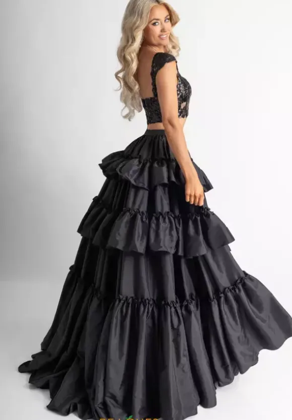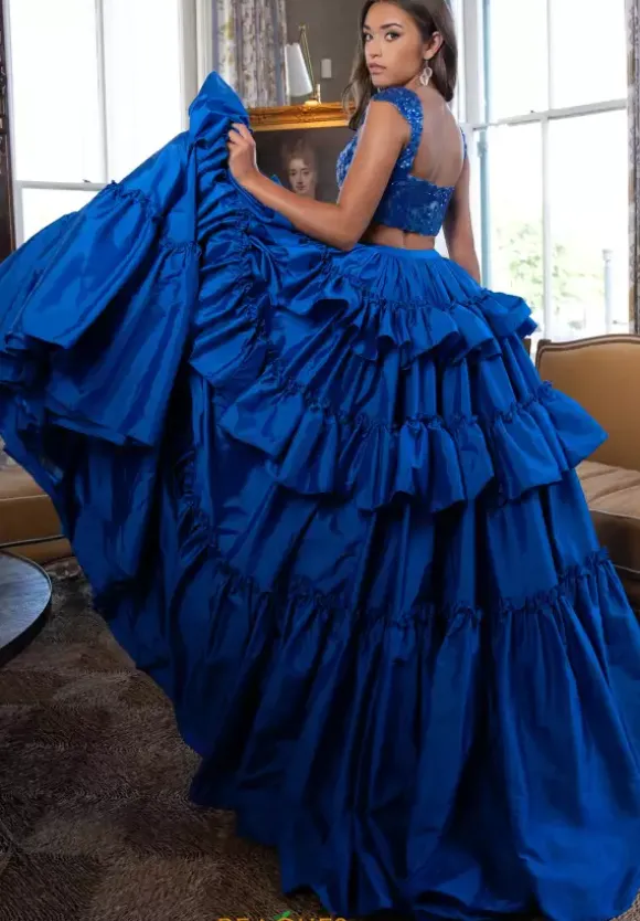Glisten and glow this prom season in this haute two piece dress by Rachel Allan style 70966. The cropped fitted bodice and sleeves are adorned in luminous sequin beaded appliques that match the color of the lavish voluminous taffeta tiered floor length skirt where a fierce thigh high slit is featured as the finishing touch.