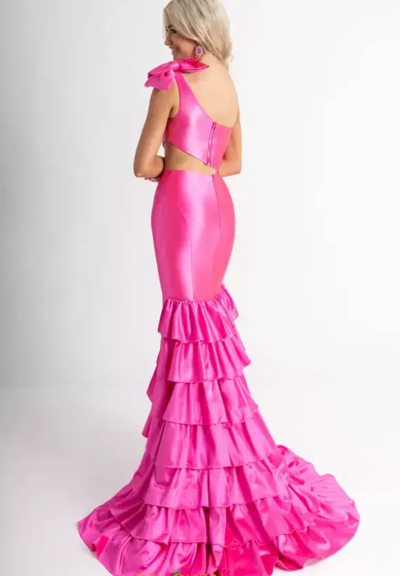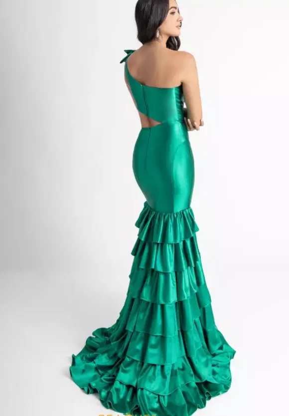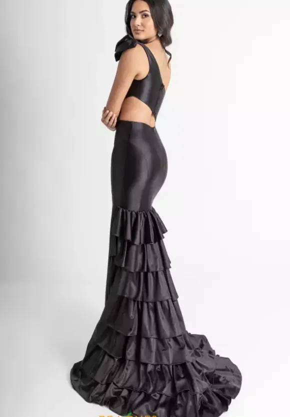 Sleek sophistication exudes when you wear this sensational stretch satin Rachel Allan long dress style 70976 to your next social occasion. This striking gown showcases a fitted bodice with an asymmetrical neckline, side cut out and single shoulder strap with bow. The long straight skirt has tiered ruffle details in the back that fall into a sweeping back train.