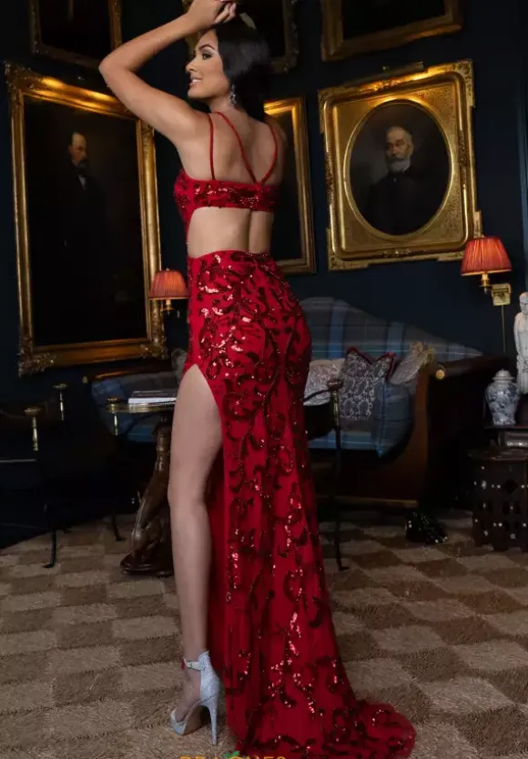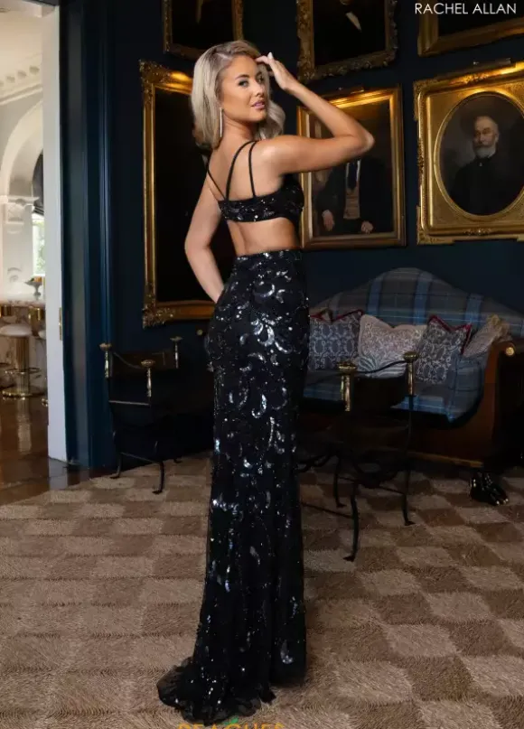 Be the talk of the night wearing long fitted dress by Rachel Allan, style 70977. Showcasing an endearing deep V neckline paired a high thigh slit and open side cut outs that go into a sexy open back. Illuminating beadwork is embellished into the tulle material that cascade from the top to bottom for endless sparkle.