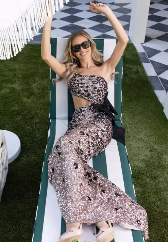 Stay on trend for Prom and rock this beaded animal print Rachel Allan long dress style 70992. Covered in patterned sequins and beads, this scintillating gown features a single shoulder fitted bodice with one side cut out and big taffeta bow at the waist. The long slim skirt will cling to your curves draping the floor with a back sweep train.