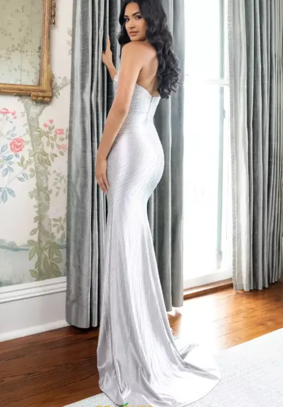 Look sizzling hot in this brilliant Rachel Allan long dress style 70997 made in vivid colors of stretch satin embellished with sparkling heat set stones. This magnificent gown showcases a fitted bodice with halter neck straps, ruched neckline and low back with zipper closure. The long slim skirt will hug your body beautifully with a front, side slit and back sweep train.