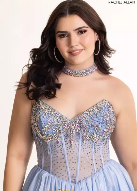 Look like a goddess in this enchanting organza ball gown style 70998 designed by Rachel Allan. This luminous gown displays reflective stone beadwork across the strapless v neckline of the sheer mesh corset bodice. The glowy organza closed skirt is completed with an unforgettable lengthy sweep train.