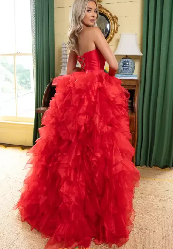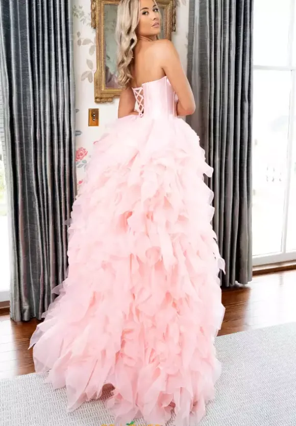 Look like a modern day princess at prom in this sensational Rachel Allan ball gown style 71018 made in a combo of crystal satin and shimmering organza fabrics. This phenomenal gown showcases a strapless corset bodice with visible boning, silver bow at waist and lace up tie back. The, a line, long full skirt has ruffle, tiered organza layers with a front slit.