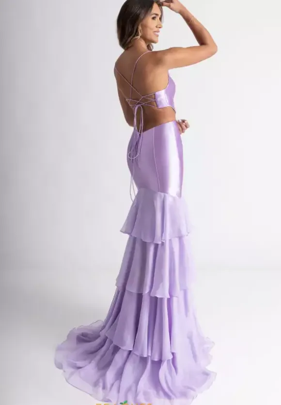 Look totally chic at prom in this astonishing Rachel Allan long dress style 71027 made in a combination of stretch satin and flowing chiffon fabrics. This impeccable gown features a fitted long bodice with side cut outs, spaghetti straps, 3D flowers on one shoulder and lace up tie open back. The long skirt is made of tier ruffle chiffon layers that fall into a sweep train.