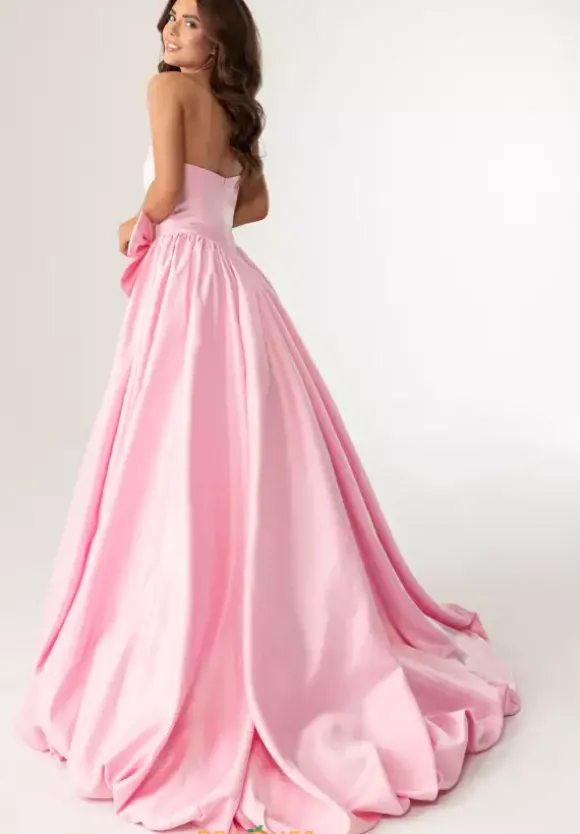 Have your fairy tale moment when you show up in this Rachel Allan ball gown style 71035. The strapless sweetheart neckline dress is made from a satin material. The structured bodice has bow details in front and continues to a full skirt with a gorgeous bubble style hem like no other. Available in stunning colors.