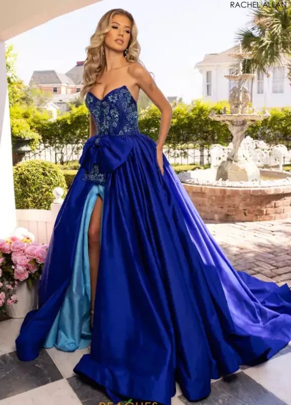 Experience an enchanting night in this stunning A line dress designed by Rachel Allan, style 71068. Showcasing a strapless V neckline and a beaded bodice with a one of a kind bow on the side. The a line skirt is made in luxurious taffeta material, giving you a timeless look. Complete this look with a stunning slit.