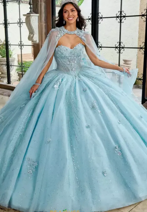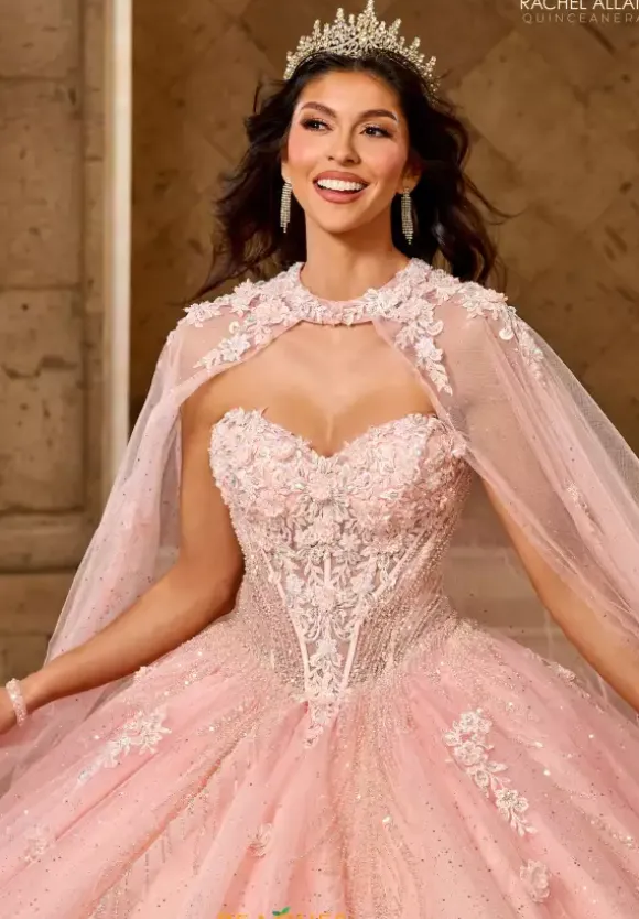 Bring the glamorous drama to your quince dress with this cape from Rachel Allan Quince style QS1162. This long flowing glitter tulle cape attaches with a collar at the front of your neck while the tulle falls. The shoulders and neckline are adorn with gorgeous appliques. This is the cape only and the dress is sold separately from Rachel Allan Quince style RQ112.