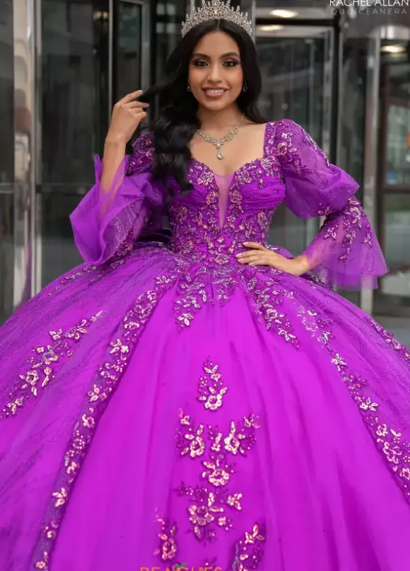 Feel like royalty in this enchanting quinceanera dress by Rachel Allan Quince, style RQ1135. Showcasing a strapless sweetheart neckline with detachable puffy long sleeves. This number is fully adorned with gorgeous applique nd glistening sequins and dazzling beadwork hat cascade down the dress. A fabulous big bow is the perfect final touch.