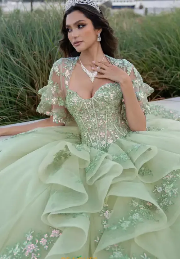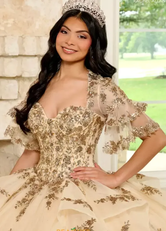 Feel like a modern day princess in this stunning ball gown Quinceanera dress from Rachel Allan Quince RQ1138. This sweetheart neckline sheer illusion corset bodice is adorn in floral inspired lace appliques with hints of sparkling sequins. The full ball gown skirt has a ruffles detail with hints of those sparkling appliques adorn all around the dress. A bolero jacket is included.