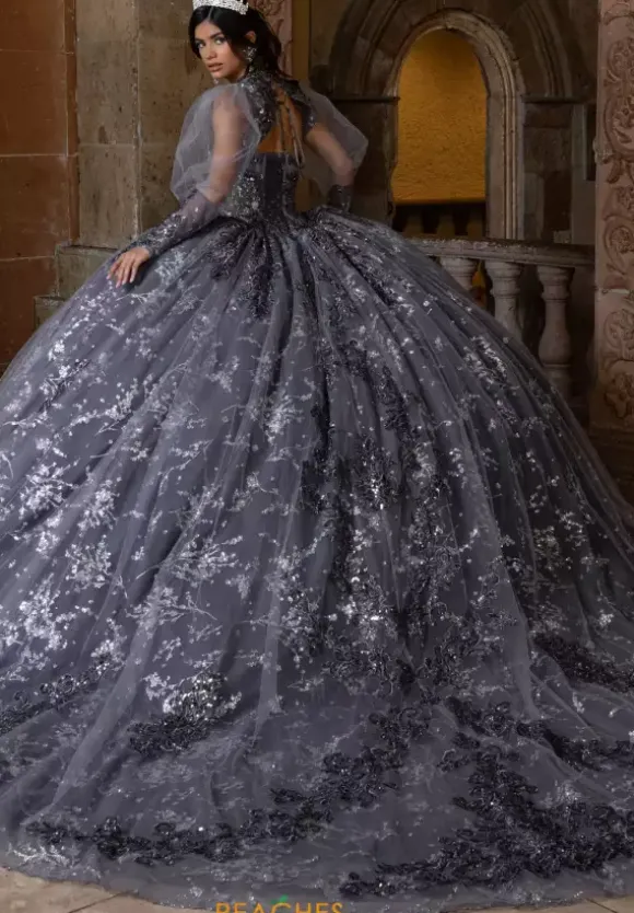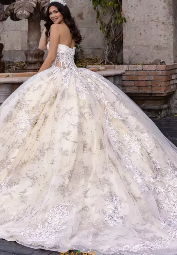 All eyes will be on you when you enter your Quinceanera in this Rachel Allan Quince dress style RQ1172. This long waisted bodice has a sheer illusion waist line with exposed boning that comes with a detachable bodice liner. The strapless scoop neckline has detachable long pouf sleeves with hanging bead work. The full ball gown skirt is made from glitter tulle.