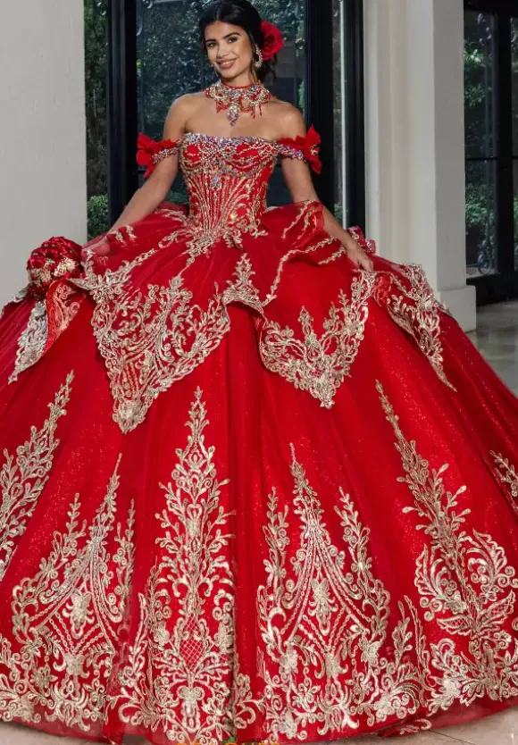 Make a lasting impression when you wear this Rachel Allan Quince ball gown style RQ1180. This fabulous dress showcases an off the shoulder cap sleeve with a scoop neckline bodice. Stunning metallic appliques adorn the dress with hints of sparkling rhinestone beadwork. The tiered layered full skirt continues those appliques with a detachable bow in the back.