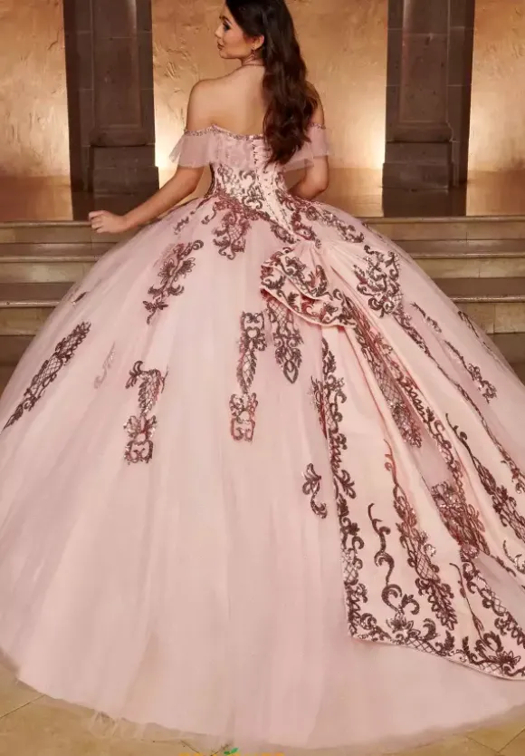 Charming and charismatic, this dashing Rachel Allan Quince ball gown RQ2166. This gorgeous dress features a lovely scoop neckline with dainty off the shoulder cap sleeves. Gleaming sequined appliques illustrate an intricate embroidery that will dazzle all in sight. Made in a fabulous tulle fabric, the a full ball gown skirt showcases a lovely detachable bow.