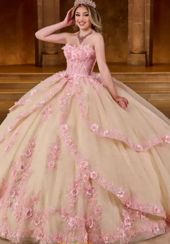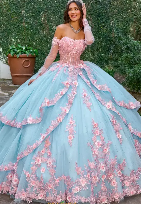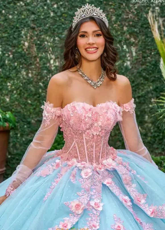 We just love this two tone color Rachel Allan quinceanera long dress style RQ2196. The strapless corset style bodice is adorn in three dimensional flowers over lace material. The full tulle skirt is layered with each layered decked with matching appliques from the bodice around the trim. Fingerless gloves and a detachable bow add to the statement.