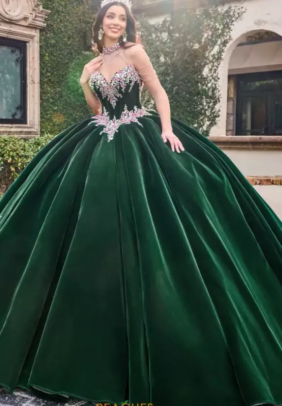 Rich velvet material gives this Rachel Allan quinceanera dress style RQ2198 that regal look. The strapless sweetheart neckline bodice is embellished with multi color rhinestone beading and sequins. The v dip waist is also trimmed with those matching rhinestone beading from the bodice. The full ball gown style skirt is made from rich velvet material.