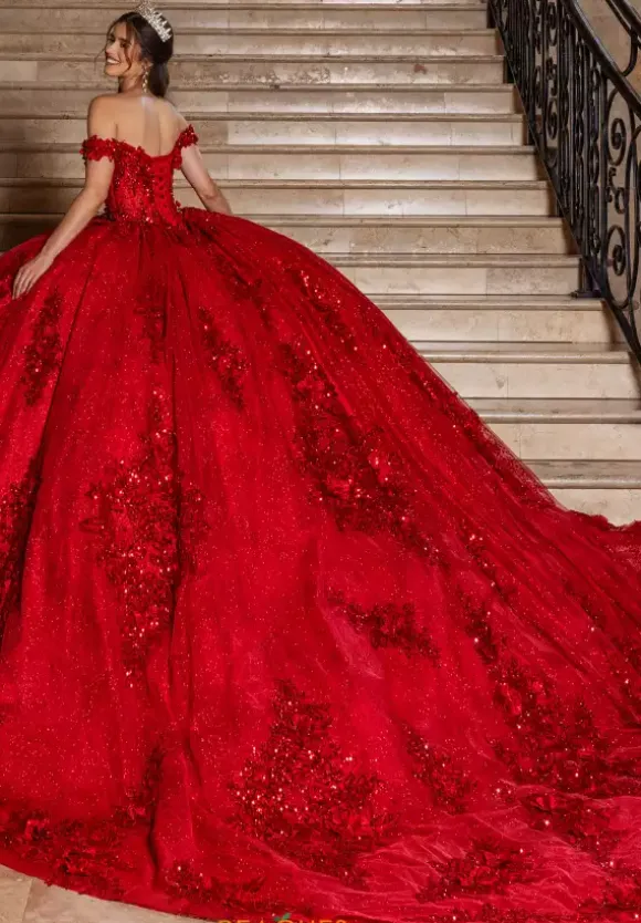 Feel regal and grand in this gorgeous sparkling ball gown from Rachel Allan Quinceanera style RQ2215. Available in bold statement colors, this dress features an off the shoulder cap sleeve neckline. The bodice is bedazzles with sparkling glitter and sequins appliques over exposed boning of the corset. The full ball gown tulle skirt continues those matching appliques all along the hem line and the long flowing train.