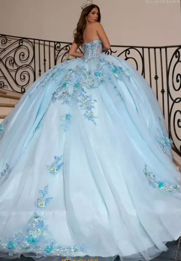 Show off your sense of fashion in this Rachel Allan Quince ball gown style RQ2216. This amazing dress has a strapless sweetheart neckline bodice. Three dimensional flowers adorn the long waisted corset bodice. There is a detachable bodice liner if you want to have the midriff be a sheer illusion. Detachable streamers sleeves give you a two in one look. The full glitter tulle ball gown skirt is adorn with those matching appliques from the bodice.