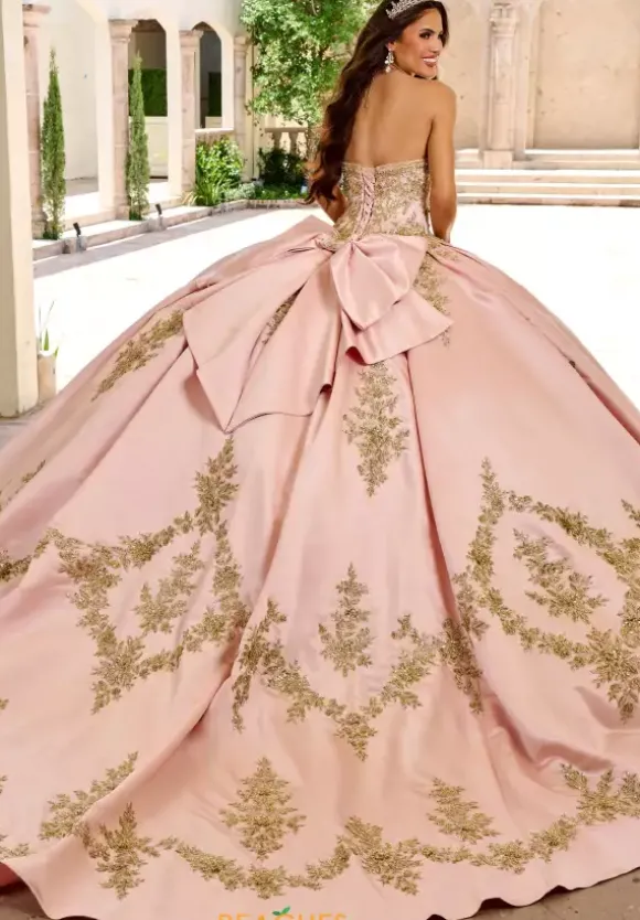 Captivate your audience when you wear this dress by Rachel Allan Quince style RQ2217. This ball gown dress features a strapless sweetheart neckline with off the shoulder detachable long sleeves. The quinceneara dress is decorated top to bottom with intricately placed appliques and beading revealing a stunning pattern. This satin dress features a detachable bow paired seamlessly with the train.