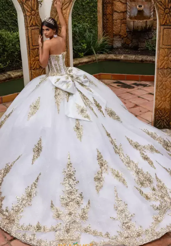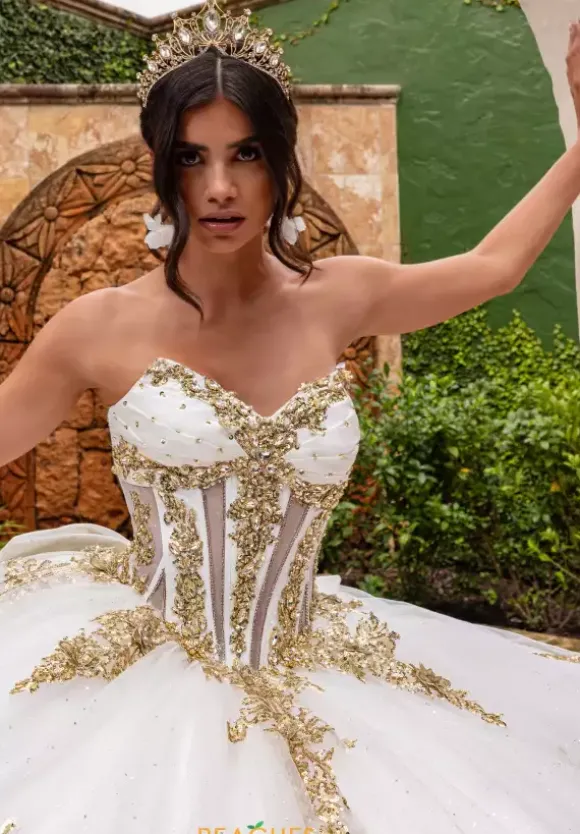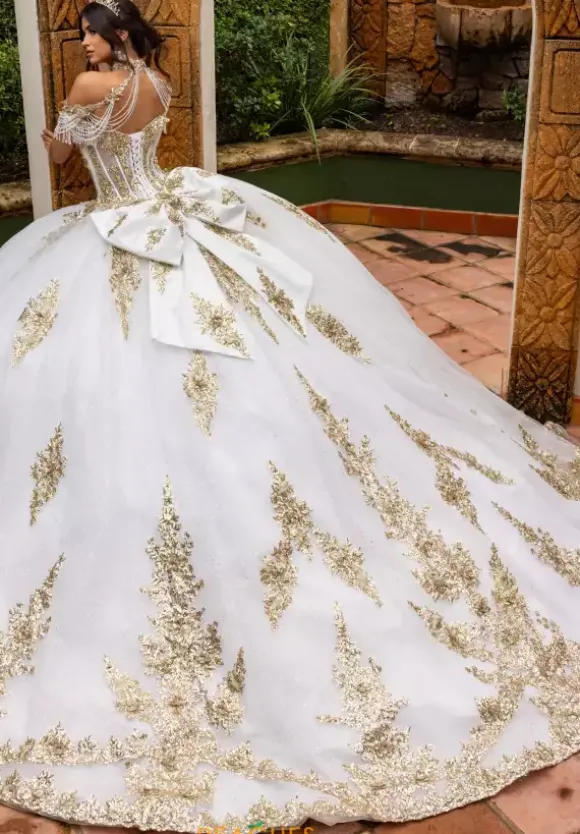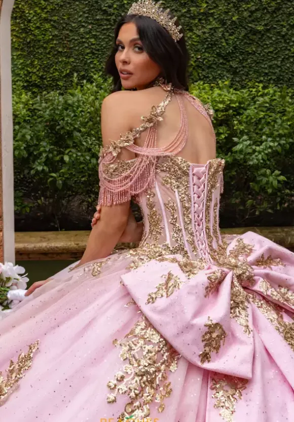 Live your princess fantasy in ball gown style RQ2225 by Rachel Allan Quinceanera. Featuring the delicate detachable off the shoulder cap sleeves adorned with lovely beading and fringe along the trim to compliment the fully beaded illusion bodice. Showcasing the captivating tulle skirt is embellished with intricate applique placed along the small of the waist and along the trim of the bottom and finishing along the beautiful train. Necklace sold separately as style QS2225.