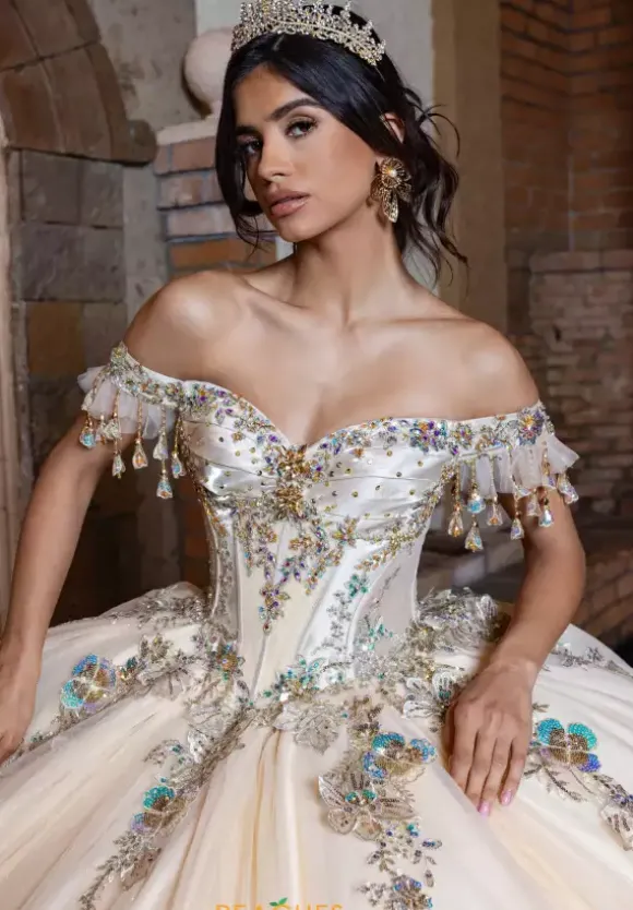 Make a grand entrance in this timeless ball gown by Rachel Allan Quince, style RQ2228. Showcasing a stunning sweetheart neckline with stylish off the shoulder cap sleeves that is adorned with dainty fringes. The detachable bodice liner let’s you create different looks as you desire. With its mesmerizing applique and lovely dreading, this dress’s train is sure to grab everyone’s attention.