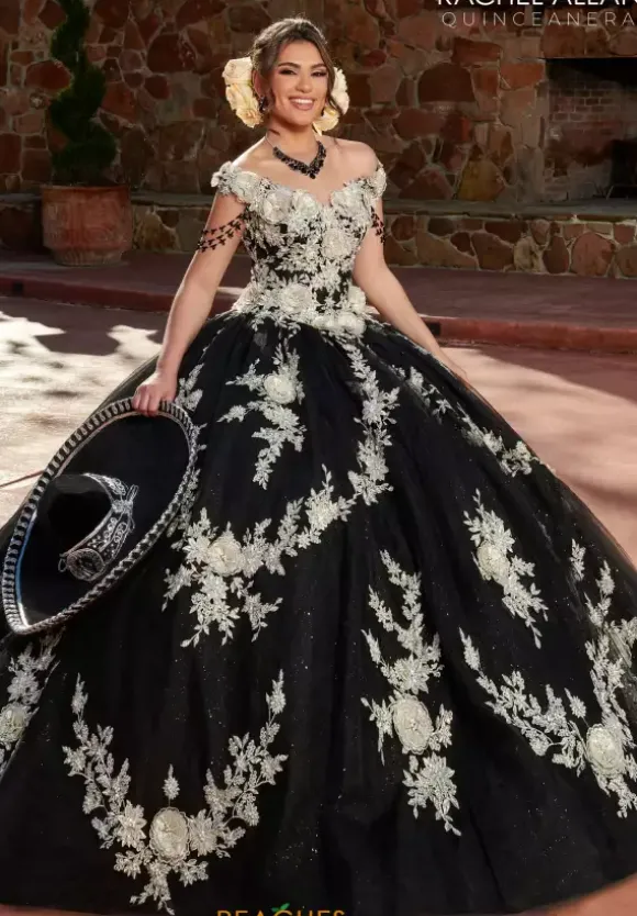 Have the time of your life in ravishing traditional style RQ3117 by Rachel Allan Quince. This ball gown dress is available in regal colors and is complemented by contrasting embroidery and appliques that create stunning patterns throughout the bodice and skirt. Draped beadwork is featured beneath the off the shoulder cap sleeves and the skirt is completed with the classic sweep train.