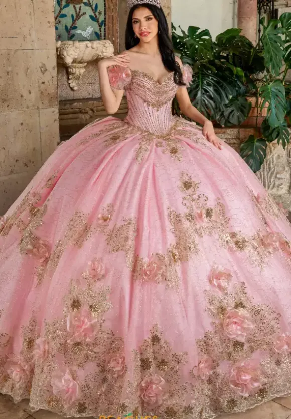 We just love all the details in this amazing Rachel Allan Quince ball gown style RQ3133. The long waisted corset bodice is beautifully beading with rhinestones and showcases off the shoulder cap sleeves with three dimensional flowers. The glitter tulle ball gown skirt has a gorgeous bow in the back and those metallic appliques wrap around the hem of the skirt.