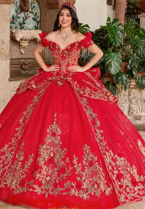 Have all eyes on you in this stunning ball gown by Rachel Allan quince RQ3137. Featuring a classy off the shoulder neckline with a cap sleeve detailed with a fringe for a unique look. Made in a glamorous tulle adorned with a floral appliques and beadwork for an eye catching look. A long dramatic train is added to complete the look.