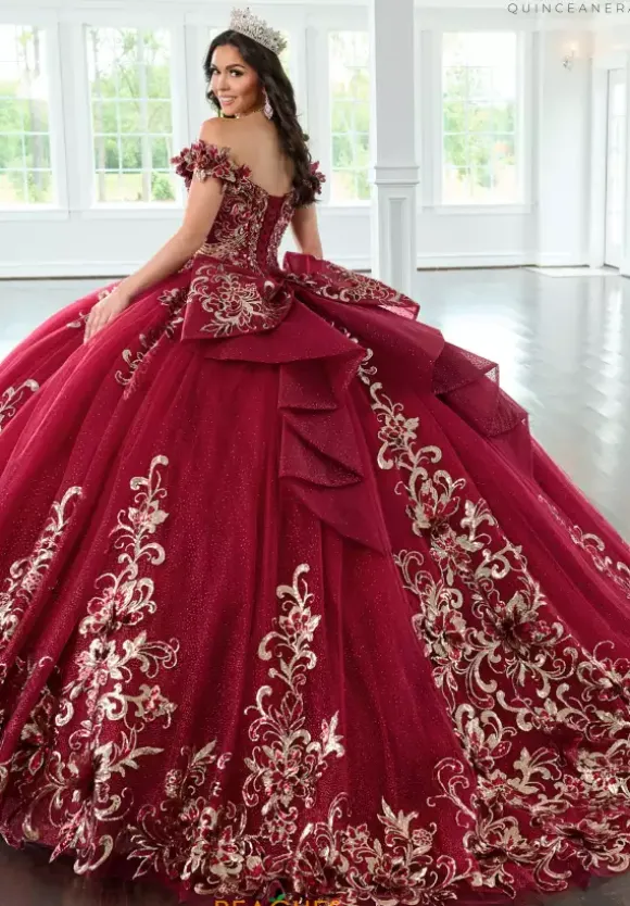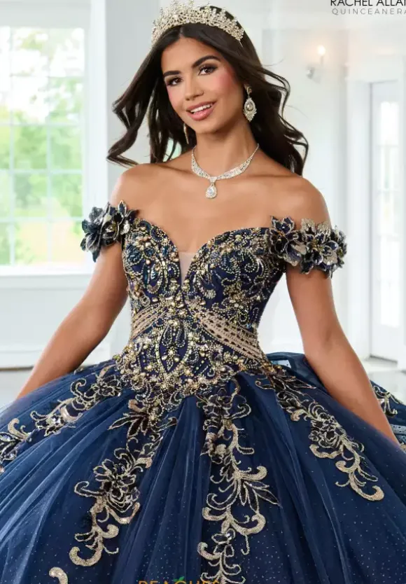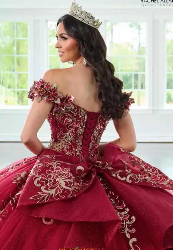 We are just in love with the attention to detail in this stunning Rachel Allan Quince ball gown style RQ3145. This beautifully bedazzles long waisted corset bodice showcases an off the shoulder cap sleeve with a sweetheart neckline. Gorgeous gold beading and appliques pop and then travel down the full tulle ball gown skirt. The hem of the dress is trimmed in these large gold appliques that complete the look. A detachable bow is in the back.