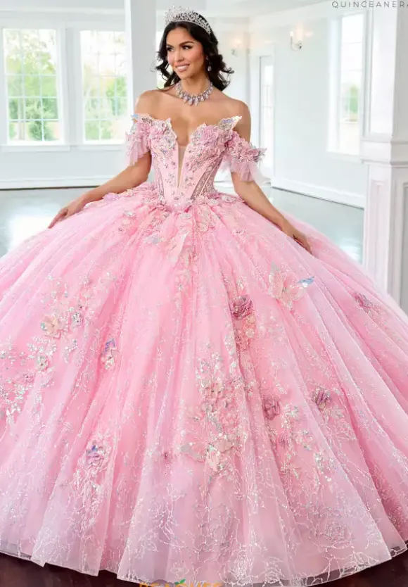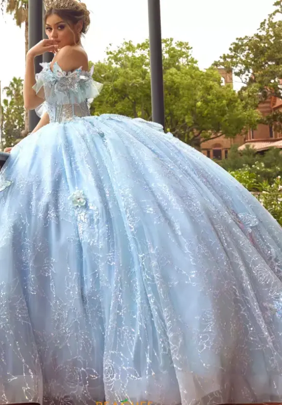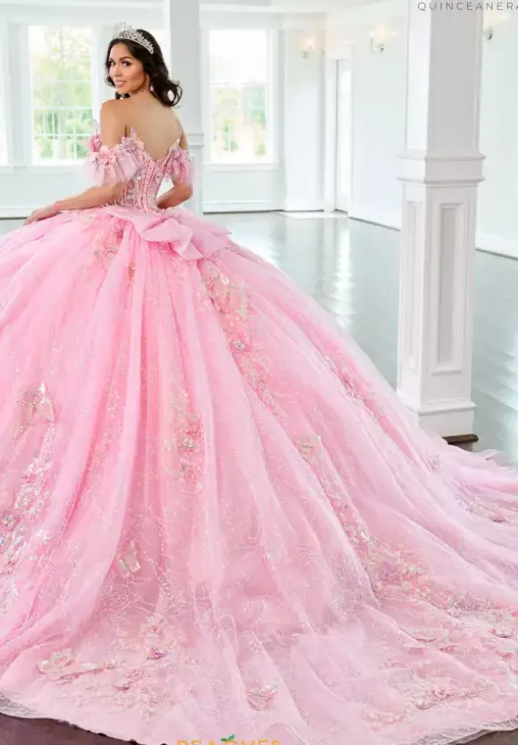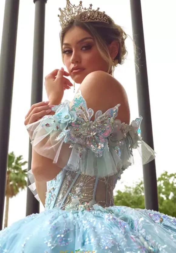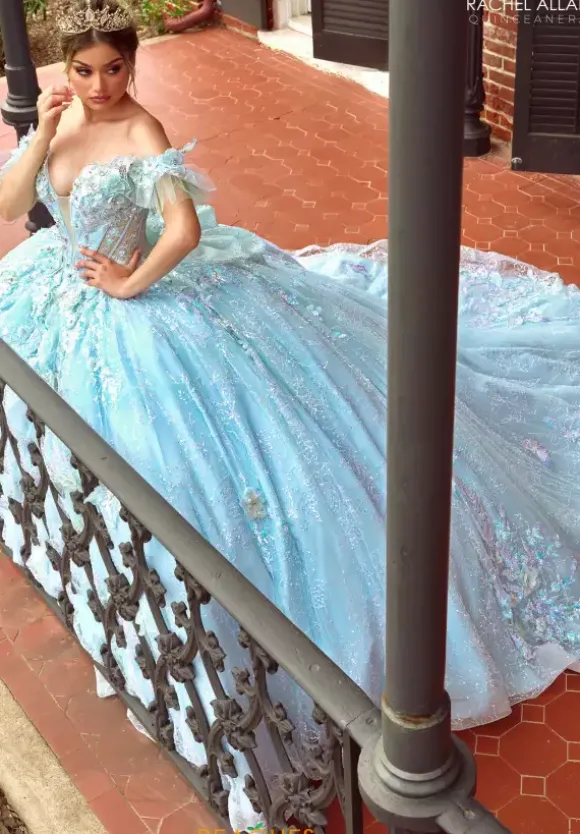 Look like a princess in this dress by Rachel Allan style RQ3149. This Quinceanera dress features a v neckline with a mesh panel matched with an off the shoulder detachable cap sleeve. The bodice features a corset and a lace up in the back as well as a detachable bodice liner. This dress is decorated with applique, beading and glitter tulle that seam well with the flowing train and the cutesy bow.