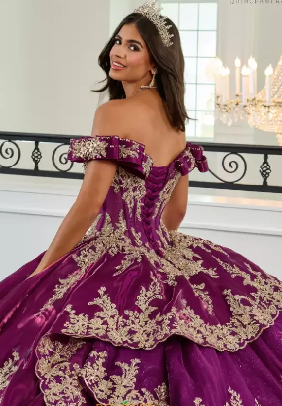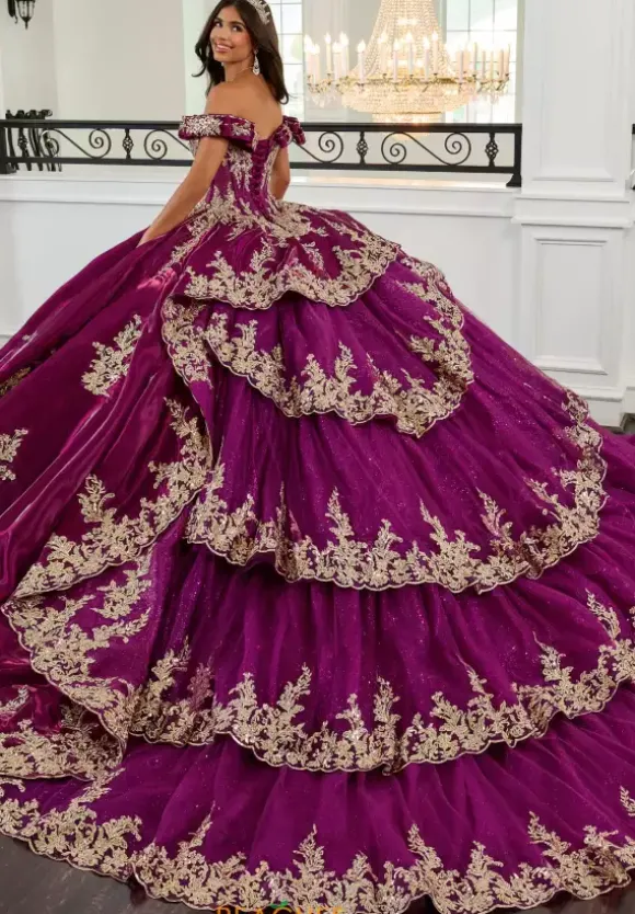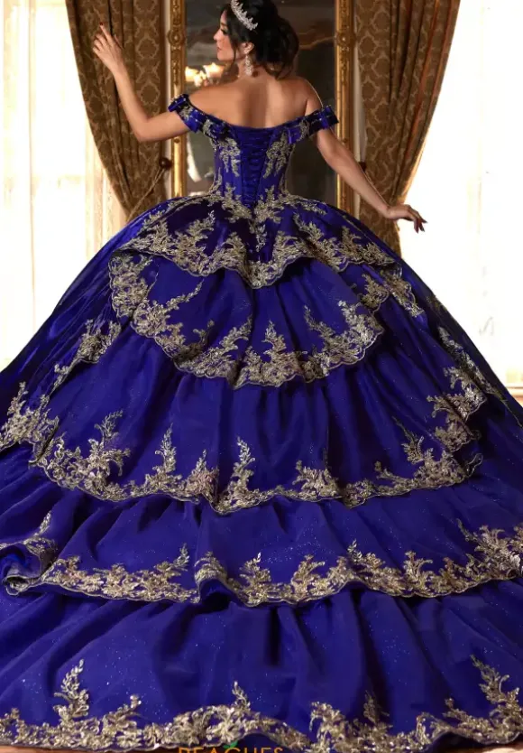 Feel like royalty in this regal ball gown from Rachel Allan Quince style RQ3151. Made from a glistening organza material embellished with metallic gold appliques. The long waisted corset bodice has a detachable bodice liner and off the shoulder cap sleeves. The back train showcases a multi layered long train with each layer trimmed in the matching appliques.