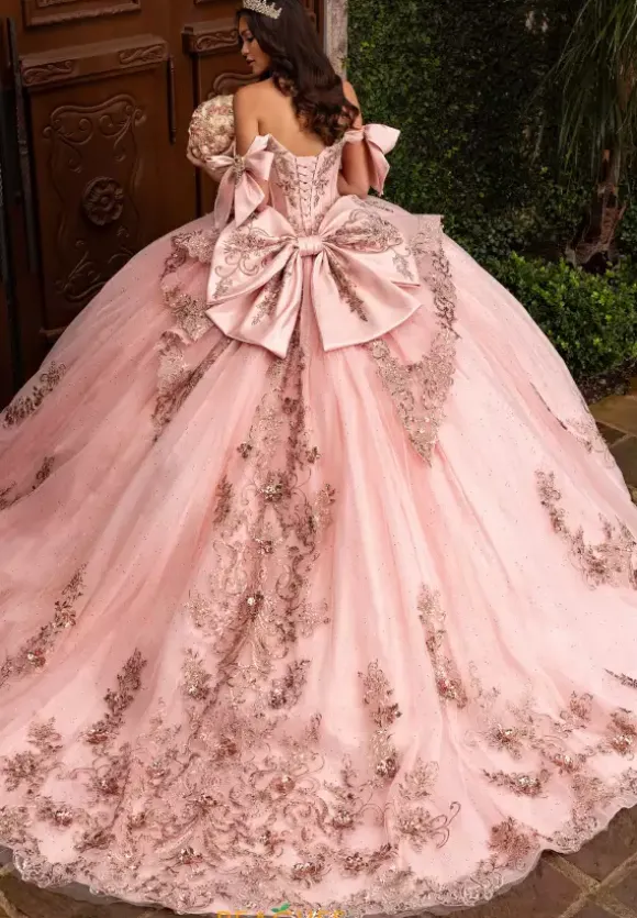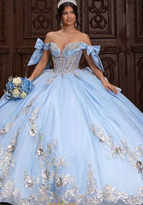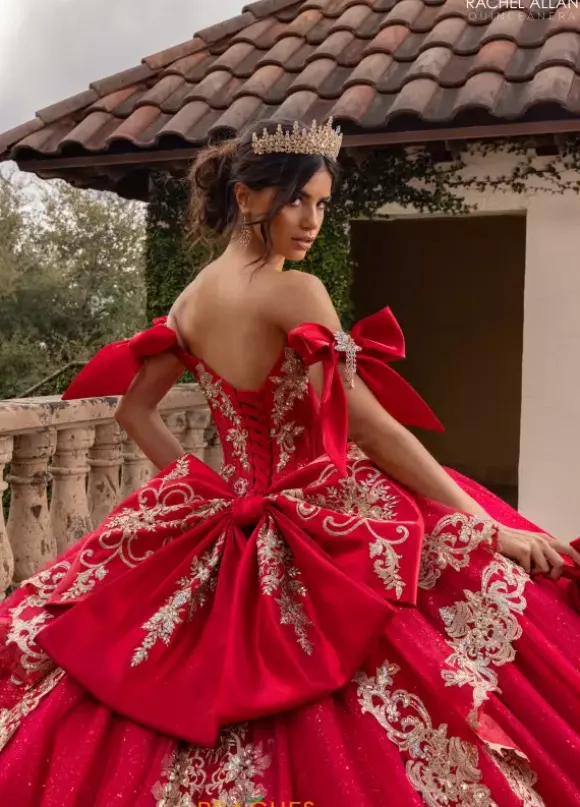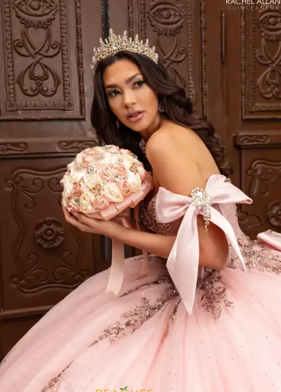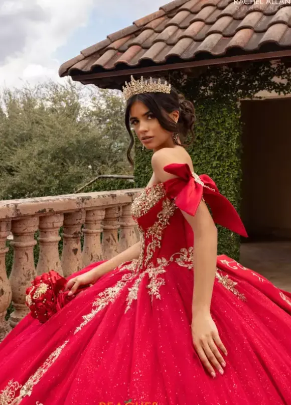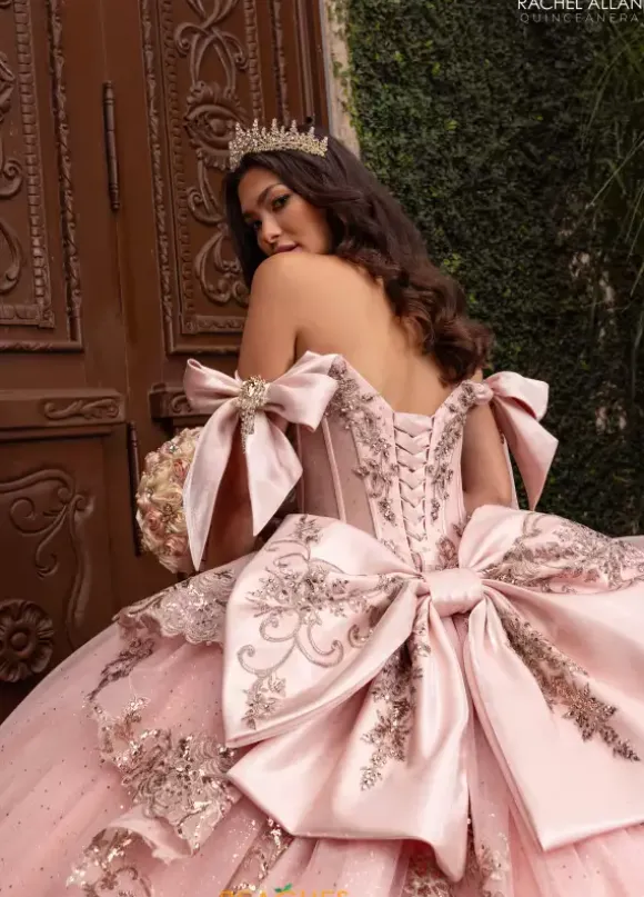 Dance the night away wearing Rachel Allan Quince style RQ3155. This captivating ball gown showcases an elegant sweetheart neckline with draping off the shoulder cap sleeves that tie beautifully into a bow. The beaded built in corset bodice shows off your waist flowing into the glitter tulle skirt and sweep train.