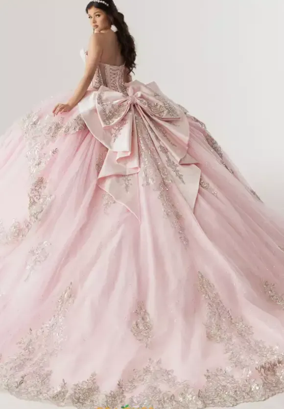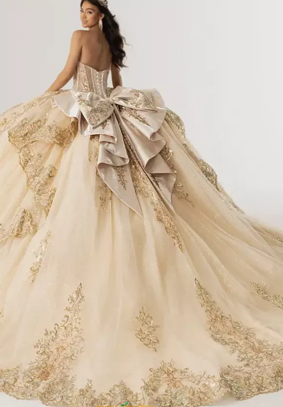 Look and feel as pretty as a princess in this princess styled Rachel Allan Quince ball gown style RQ3172. This sparkling voluminous satin gown includes a matching detachable cape that overlaps the shimmering applique embellished sweep train. The satin bodice has a traditional adjustable lace up closure.