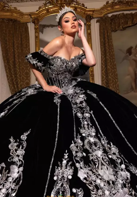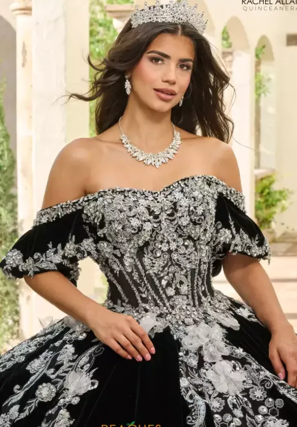 Be bold and wear this black and silver ball gown from Rachel Allan Quince on your special day. Style RQ5011 is made from rich velvet material with amazing silver metallic detailing that adorns the dress. The corset style bodice has a sweetheart neckline with off the shoulder cap sleeves. The waistline has a detachable bodice liner.
