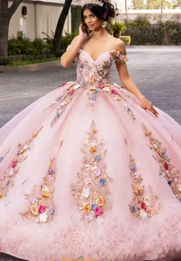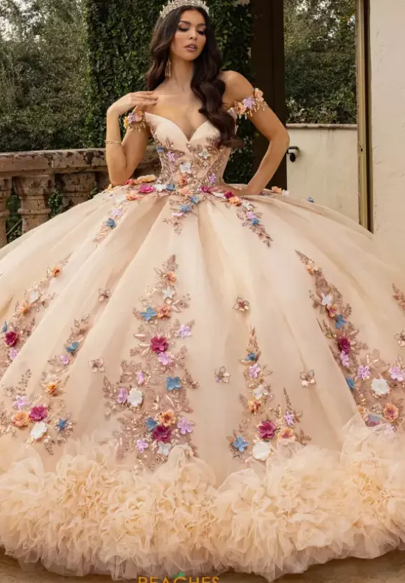 Be the talk of the night wearing Rachel Allan Quince style RQ6000. This one of a kind ball gown showcases a lovely v neckline with off the shoulder cap sleeves. The gorgeous fitted bodice and full glitter tulle skirt is adorn with unique multi color floral applique and eye catching sweep train that will have all eyes on you.