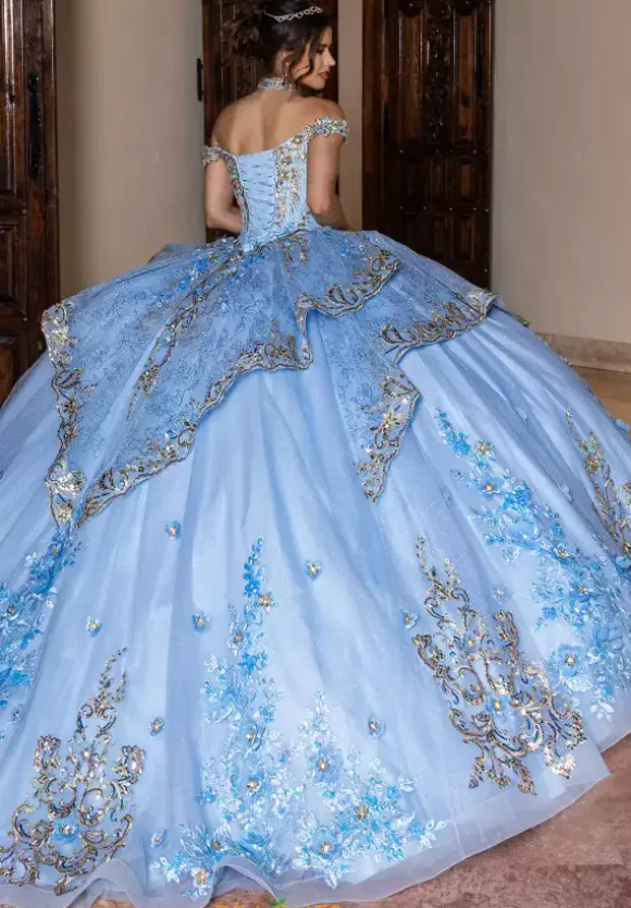 Have heads spinning upon your entrance in spectacular ball gown style RQ6010 by Rachel Allan Quince. The fully embellished fitted lace corset bodice is complimented with detachable puffy cap sleeves and a matching chocker. Showcasing the unique glittered tulle skirt and delicate bow will have all heads turning.